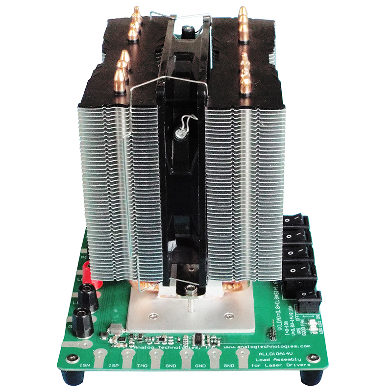 This load assembly, ALLD10A14V, is designed to emulate laser diodes for evaluating multiple series of laser drivers, including ATLSxA103D, ATLSxA104D, ATLSxA214D, ATLSxA216D, etc. These laser drivers can be used to drive one or multiple laser diodes with high efficiency and low noise for DPSSL, EDFA, or fiber laser applications. They accept wide range input voltage and their output voltage can be from 0V to almost the same as the input voltage. The size is very small, but can output high current, high voltage, thus high output power. In addition, these laser drivers have low output noise (except that there is a 500kHz 4mVP-P ripple voltage at the output) and wide modulation bandwidth. This laser load assembly can be used with this ATLS216DEV1.0 evaluation board, or be used alone, as a dummy laser load, to emulate one or multiple laser diodes.