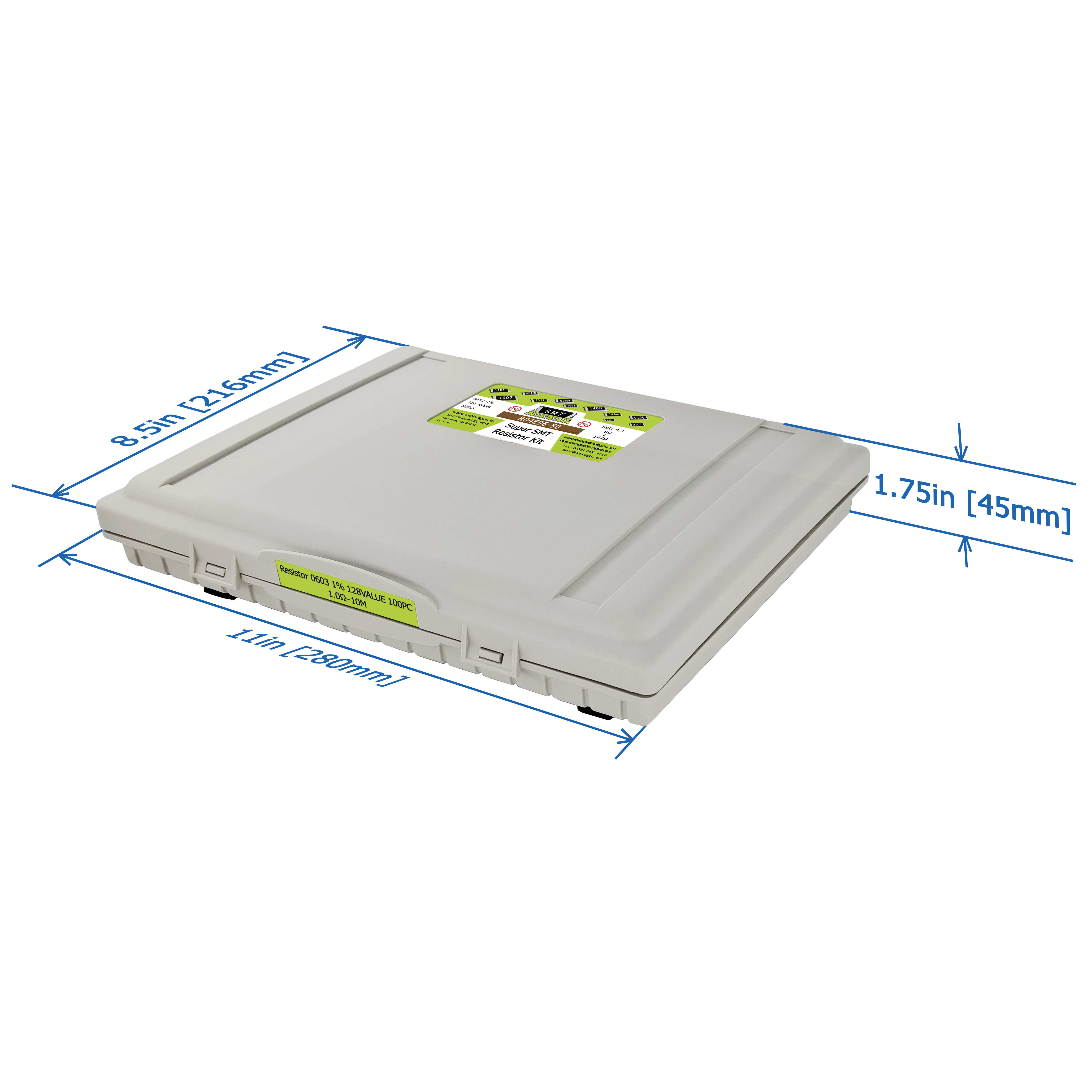 By its name, this 128-Bin Resistor Kits use our patented Super Enclosure which has 128 individually lidded and labeled bins for storing up to 128 different types of SMD resistors. Figure 2’s shows the photos of the Super Enclosure. Figure 1 shows the Super Enclosure dimensions. Table 3 is the selection guide for different type of kits available in this series and their online purchasing links. The kits are categorized by the size of the resistors, the number of values/kit, and the number of pieces/value. Table 1 shows the specifications of the resistors. Please note that for the 510 value kit, it covers all the E-96 series resistance values; for the 128 values, it covers approximately the E-24 series resistance values, but implemented by 1% resistors, as opposed to ±5% resistors. For example, our selected resistor value is 2.49Ω,whiletheoriginal E-24valueis2.4Ω. Operating the enclosure is easy and convenient so that your time for obtaining a particular resistor is minimized to just seconds.