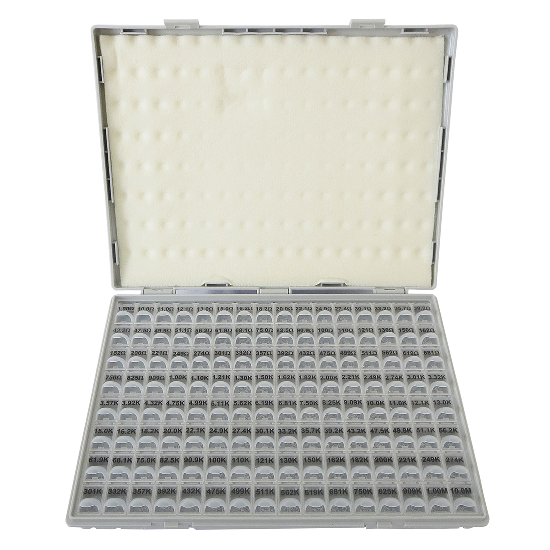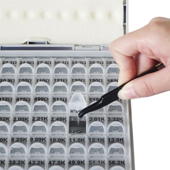 By its name, this 128-Bin Resistor Kits use our patented Super Enclosure which has 128 individually lidded and labeled bins for storing up to 128 different types of SMD resistors. Figure 2’s shows the photos of the Super Enclosure. Figure 1 shows the Super Enclosure dimensions. Table 3 is the selection guide for different type of kits available in this series and their online purchasing links. The kits are categorized by the size of the resistors, the number of values/kit, and the number of pieces/value. Table 1 shows the specifications of the resistors. Please note that for the 510 value kit, it covers all the E-96 series resistance values; for the 128 values, it covers approximately the E-24 series resistance values, but implemented by 1% resistors, as opposed to ±5% resistors. For example, our selected resistor value is 2.49Ω,whiletheoriginal E-24valueis2.4Ω. Operating the enclosure is easy and convenient so that your time for obtaining a particular resistor is minimized to just seconds.