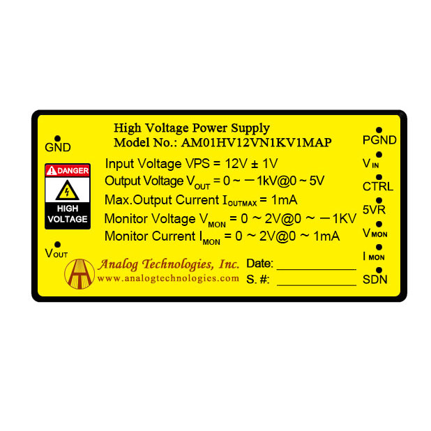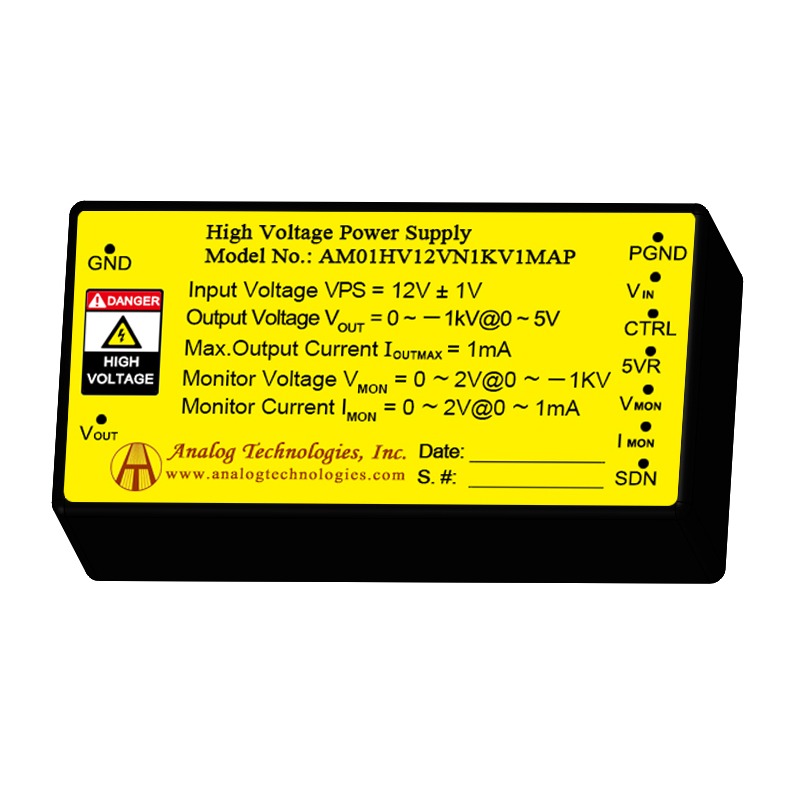 AM01HV12VN1KV1MAP is a combination of switching step-up technology and linear regulation, which converts the low input voltage into a stable high output voltage. It comes with output short-circuit protection and a wide range of output voltage adjustments. This high voltage power supply also features ultra-small size, light weight, moisture proof, shockproof, metal enclosure, and zero EMIs.