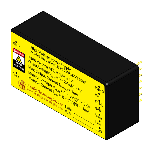 AM01HV12VP2KV1MAP is a combination of switching step-up technology and linear regulation, which converts the low input voltage into a stable high output voltage. It comes with output short-circuit protection and a wide range of output voltage adjustments. This high voltage power supply also features ultra-small size, light weight, moisture proof, shockproof, metal enclosure, and zero EMIs.