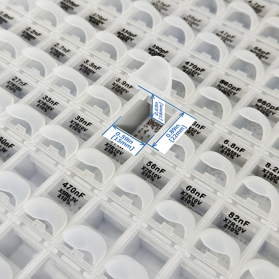 which has 128 individually lidded compartments, 0.87”(L) x 0.59”(W) x 0.63”(D) or 22 x 15 x 16 (mm).