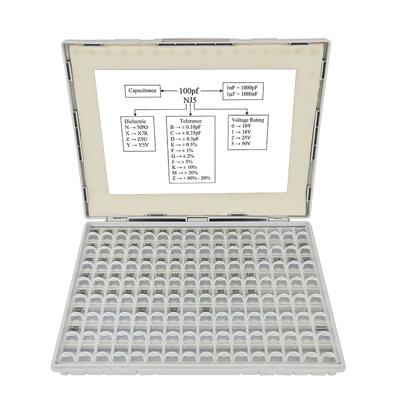 The capacitors are pre-sorted and stored separately with their main specifications, capacitance, material, voltage, and tolerance, clearly marked on each lid, see the photo on the
