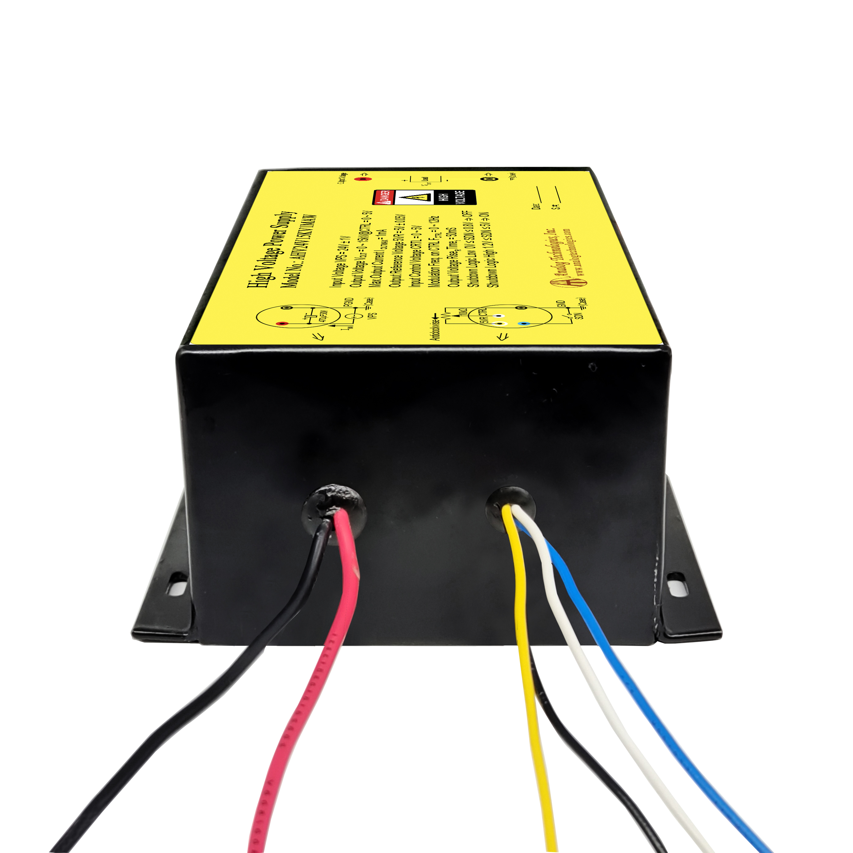 Draw a clear distinction between input lead and output lead: input 24V (red lead), ground electrodes (black lead), regulation wire (white lead), reference voltage 5V (yellow lead), shutdown (blue lead), and output high-tension cable (thick brown lead).