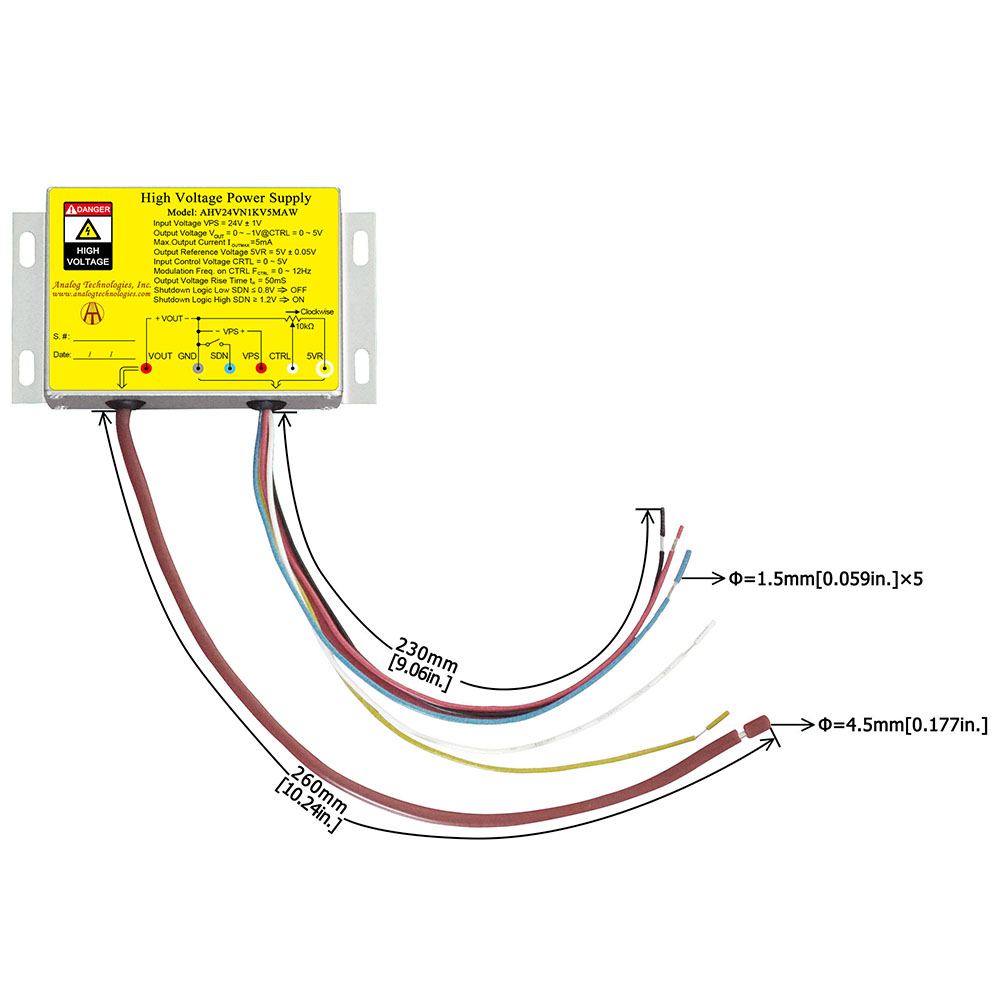 Draw a clear distinction between input lead and output lead: input 24V (red lead), ground electrodes (black lead), regulation wire (white lead), reference voltage 5V (yellow lead), shutdown (blue lead), and output high-tension cable (thick brown lead).