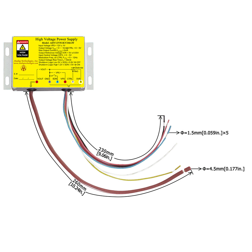 Draw a clear distinction between input lead and output lead: input 12V (red lead), ground electrodes (black lead), regulation wire (white lead), reference voltage 5V (yellow lead), shutdown (blue lead), and output high-tension cable (thick brown lead).