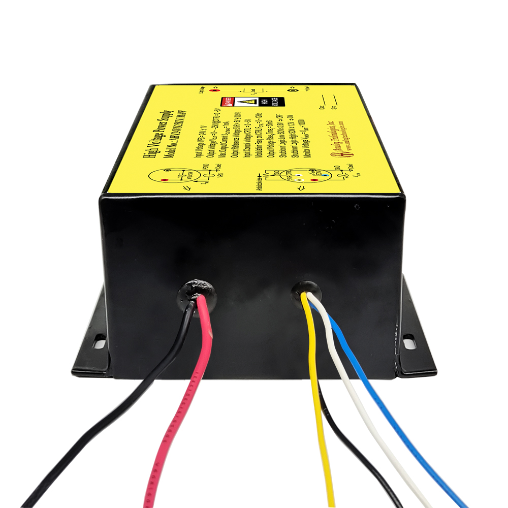 Draw a clear distinction between input lead and output lead: input 24V (red lead), ground electrodes (black lead), regulation wire (white lead), reference voltage 5V (yellow lead), shutdown (blue lead), and output high-tension cable (thick brown lead).
