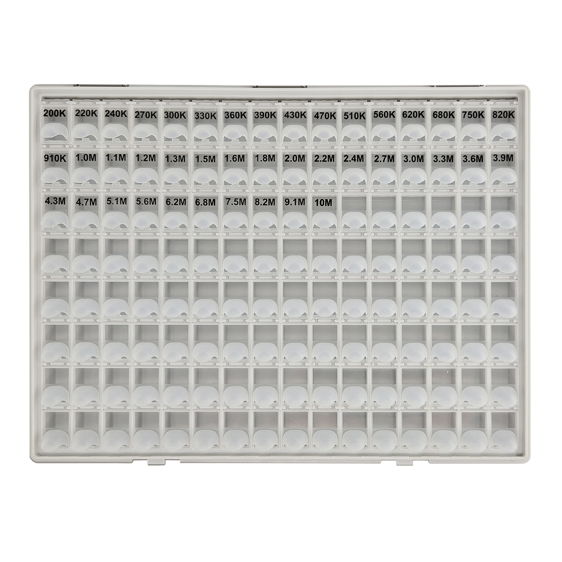 By its name, this 128-Bin Resistor Kits use our patented Super Enclosure which has 128 individually lidded and labeled bins for storing up to 128 different types of SMD resistors. Figure 2’s shows the photos of the Super Enclosure. Figure 1 shows the Super Enclosure dimensions. Table 3 is the selection guide for different type of kits available in this series and their online purchasing links. The kits are categorized by the size of the resistors, the number of values/kit, and the number of pieces/value. Table 1 shows the specifications of the resistors. Please note that for the 510 value kit, it covers all the E-96 series resistance values; for the 128 values, it covers approximately the E-24 series resistance values, but implemented by 1% resistors, as opposed to ±5% resistors. For example, our selected resistor value is 2.49Ω,whiletheoriginal E-24valueis2.4Ω. Operating the enclosure is easy and convenient so that your time for obtaining a particular resistor is minimized to just seconds.