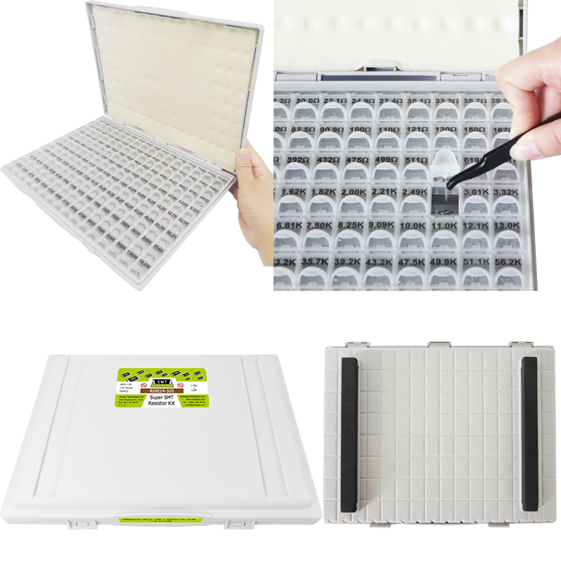 By its name, this 128-Bin Resistor Kits use our patented Super Enclosure which has 128 individually lidded and labeled bins for storing up to 128 different types of SMD resistors. Figure 2’s shows the photos of the Super Enclosure. Figure 1 shows the Super Enclosure dimensions. Table 3 is the selection guide for different type of kits available in this series and their online purchasing links. The kits are categorized by the size of the resistors, the number of values/kit, and the number of pieces/value. Table 1 shows the specifications of the resistors. Please note that for the 510 value kit, it covers all the E-96 series resistance values; for the 128 values, it covers approximately the E-24 series resistance values, but implemented by 1% resistors, as opposed to ±5% resistors. For example, our selected resistor value is 2.49Ω,whiletheoriginal E-24valueis2.4Ω. Operating the enclosure is easy and convenient so that your time for obtaining a particular resistor is minimized to just seconds.