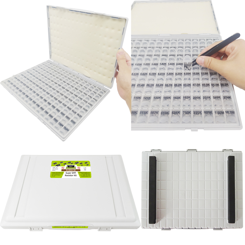 By its name, this 128-Bin Resistor Kits use our patented Super Enclosure which has 128 individually lidded and labeled bins for storing up to 128 different types of SMD resistors. Figure 2’s shows the photos of the Super Enclosure. Figure 1 shows the Super Enclosure dimensions. Table 3 is the selection guide for different type of kits available in this series and their online purchasing links. The kits are categorized by the size of the resistors, the number of values/kit, and the number of pieces/value. Table 1 shows the specifications of the resistors. Please note that for the 510 value kit, it covers all the E-96 series resistance values; for the 128 values, it covers approximately the E-24 series resistance values, but implemented by 1% resistors, as opposed to ±5% resistors. For example, our selected resistor value is 2.49Ω,whiletheoriginal E-24valueis2.4Ω. Operating the enclosure is easy and convenient so that your time for obtaining a particular resistor is minimized to just seconds.