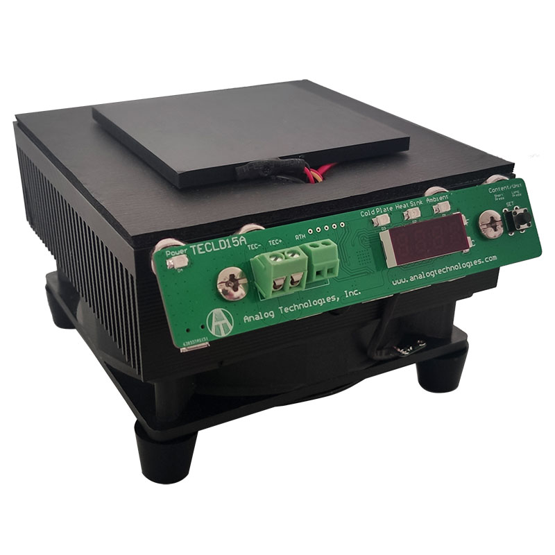 The TECLD15A is a TEC controller load assembly that comes with one TEC module, one heat sink, one high efficiency fan on the hot side, and one large-size platform, etc. A digital display shows the temperature of the cold plate and the heat sink, and the ambient temperature. Note: The platform is made of 6063 aluminum alloy. The material, size and shape of the platform and the specifications of the TEC module can be customized.