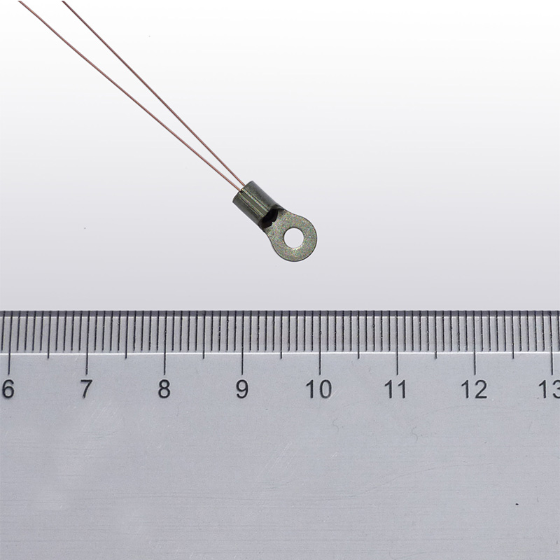 The ATH100KL2B is a thermistor assembly with a glass encapsulated thermistor packaged in an extra compact ring lug. The ATH100KL2B series thermistor consists of three versions, ATH100KL2B, ATH100KL2BT70 and ATH100KL2BT70S. The ATH100KL2B has bear leads coated with copper, the ATH100KL2BT70S has the leads covered by high temperature plastic tubing and sealed by epoxy, while the ATH100KL2BT70 is the non-sealed version. Comparing with conventional assemblies containing epoxy encapsulated thermistors, ATH100KL2B series thermistor presents higher long term stability, higher reliability and wider temperature range. In addition, it has a small size and short response time.