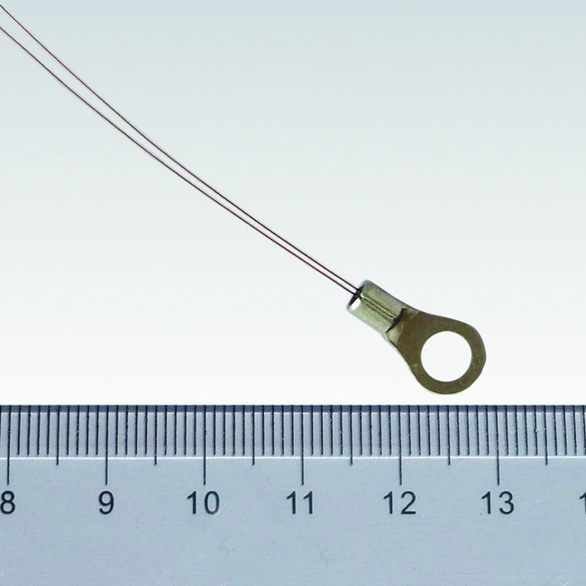 The ATH100KL2C is a thermistor assembly with a glass encapsulated thermistor packaged in an extra compact ring lug. The ATH100KL2C series thermistor consists of three versions, ATH100KL2C, ATH100KL2CT70 and ATH100KL2CT70S. The ATH100KL2C has bear leads coated with copper, the ATH100KL2CT70S has the leads covered by high temperature plastic tubing and sealed by epoxy, while the ATH100KL2CT70 is the non-sealed version. Comparing with conventional assemblies containing epoxy encapsulated thermistors, and ATH100KL2C series thermistor presents higher long term stability, higher reliability and wider temperature range. In addition, it has a small size and short response time.